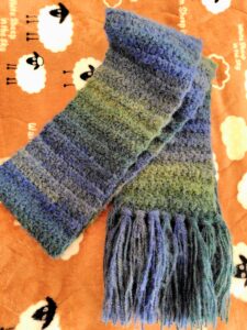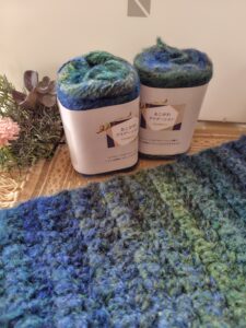 Col.2です。グリーン&ブルー&イエローの段染めで編むごとに色が変化して